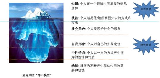 经典的“冰山模型”将人的素质分为显性素质和隐性素质,其中,隐性素质对人员的行为与表现起着关键性的作用: