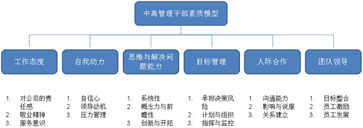 卓盟典型案例一:通过构建不同序列的岗位素质模型,采取360度测评,编制测评报告,为人员使用、后备干部选拔奠定基础。以中高层管理干部为例,我们构建了包括6个基本素质、每个素质包括3个基本特质的中高层管理干部素质模型: