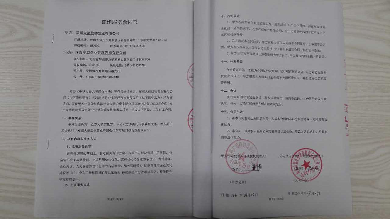 8月初,已经过了立秋节气,郑州的天气也开始慢慢的转向适宜,但卓盟咨询团队为客户服务的步伐并没有丝毫退热,随着与大德置业陈董及高层的多次沟通,顺利签约并启动大德置业常年顾问合同。