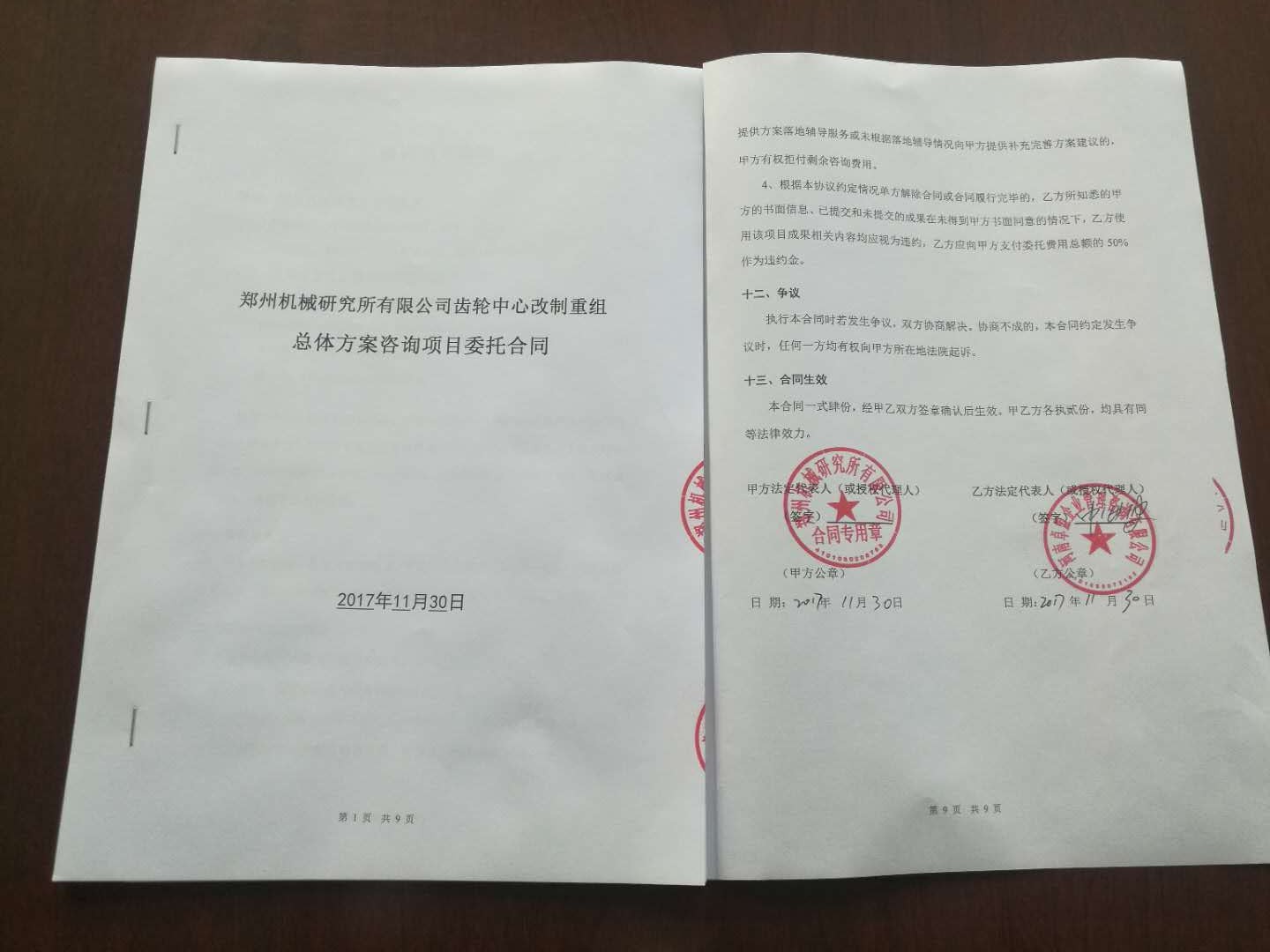 经过多轮谈判,卓盟咨询从省内多家知名咨询公司中脱颖而出,最终和郑州机械研究所达成关于郑州机械研究所齿轮中心改制重组项目的合作关系。